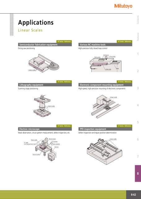 ApplicationsLinearScalesSemiconductorfabricationequipmentDicingsawpositioningVariousNCmachinetoolsHigh-precisionfullyclosedloopcontrolATSeries-ReferenceATSeries-ReferenceSlidingtableWorkpieceCuttingbladeLinearscalesLinearscaleBaseLithographyequipmentScanningstagepositioningSTSeries-ReferenceSTSeries-ReferenceElectroniccomponentmountingequipmentHigh-speed,high-precisionmountingofelectroniccomponentsLinearscalesLinearscaleElectronmicroscopeFPDinspectionequipmentMaskobservation,circuitpatternmeasurement,defectinspection,etc.DefectinspectionandrepairpositiondeterminationSTSeries-ReferenceSTSeries-ReferenceElectronbeamCCDcameraWorkchamberMonitorSiliconwaferXYtable(withintegratedlnearscales)VacuumpumpLinearscalesXYテーブル駆動方式8-62